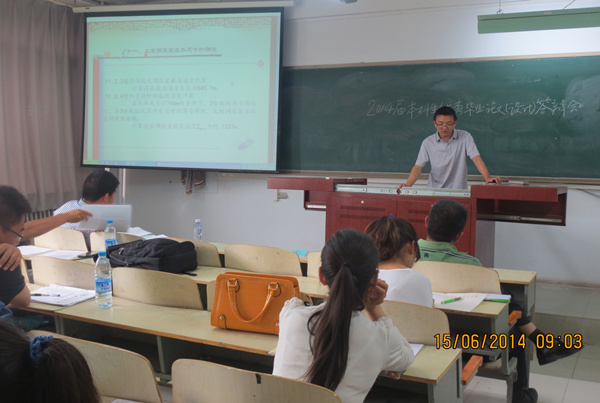 6月15日上午8:00,公司2014届本科生毕业论文(设计)二次答辩会在西区新教学楼如期举行,副经理屈忠义、史小红老师,院教学督导员郭厉生、吕志远、金淑青老师及各系主任担任评委。此次答辩共分为三组,一组为优秀毕业答辩,共14人,另外两组为第二次答辩,共30人。