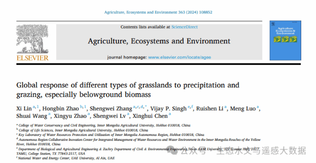 “内蒙古农业老员工态水文与遥感大数据团队”博士研究生以第一作者在《AGR ECOSYST ENVIRON》发文,团队整合了降雨和放牧对全球草原植被的影响,并研究了降水量的改变如何直接或间接地影响各种类型草原的植被群落组成,结果表明,随着放牧强度的增加,植物物种丰富度逐渐上升。降水量的增加提高了生物量,从而增加了碳积累。然而,在不同的生态系统中观察到了明显的差异,在水源充足的热带草原中,降水量的增加对植被群落的影响不大。在全球草原上,适度的放牧强度对提高植被物种丰富度最为有效。在气候较寒冷和干旱的地区,植物地下生物量对降水量变化的反应更强烈。这些发现强调了降水量变化与放牧活动之间的相互作用对全球植被生长的重要意义。这些发现对生态系统动态的理解以及未来预测具有重要意义。