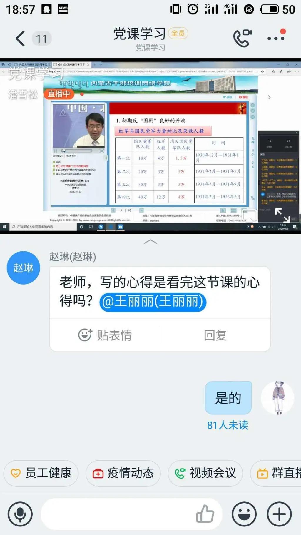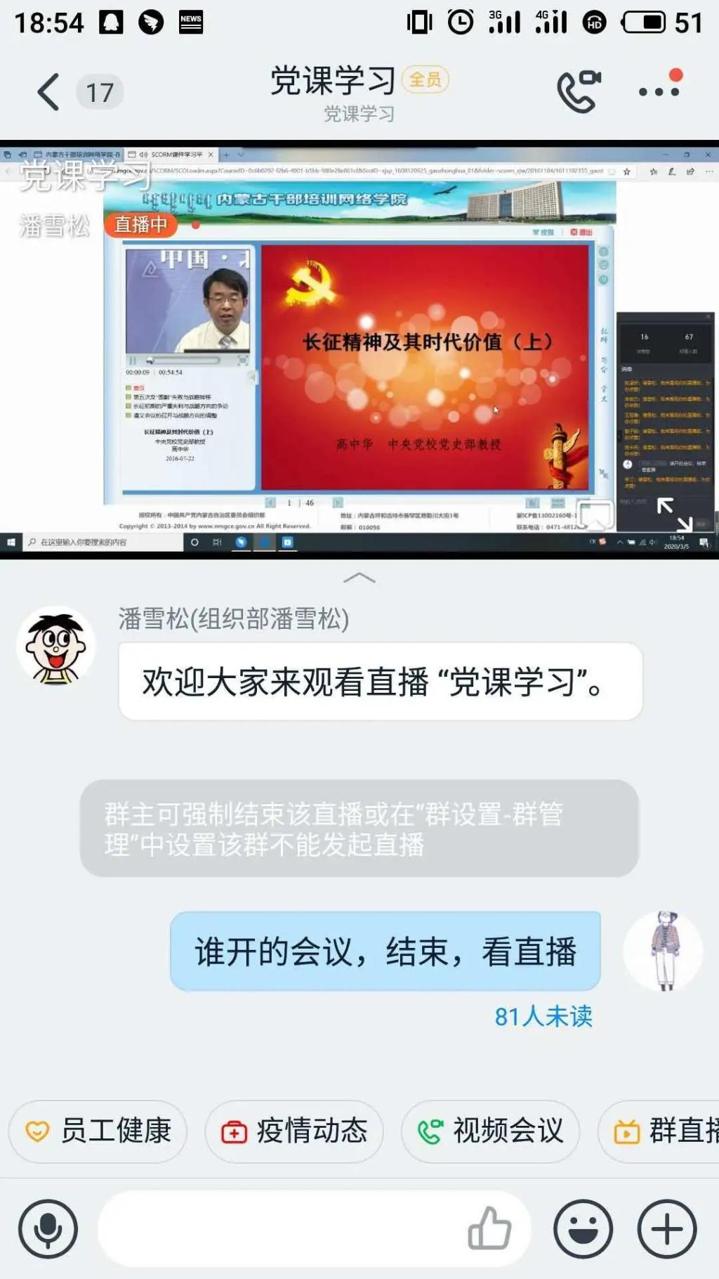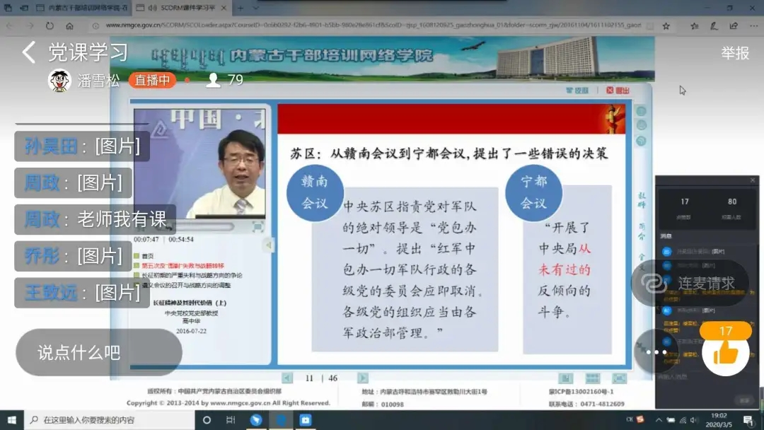 随后,大家通过线上直播的方式集体学习了由高中华老师主讲的《长征精神及其时代价值》视频。通过观看视频,各位学员也了解到了长征精神的来源及历史意义,也定会发扬长征精神,做又红又专的新时代青年。