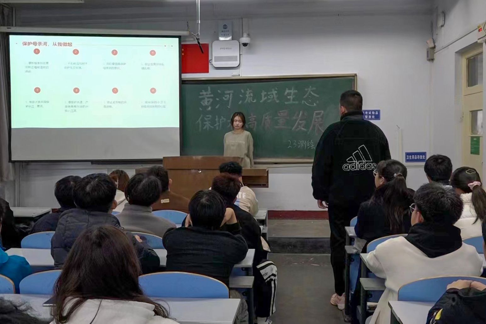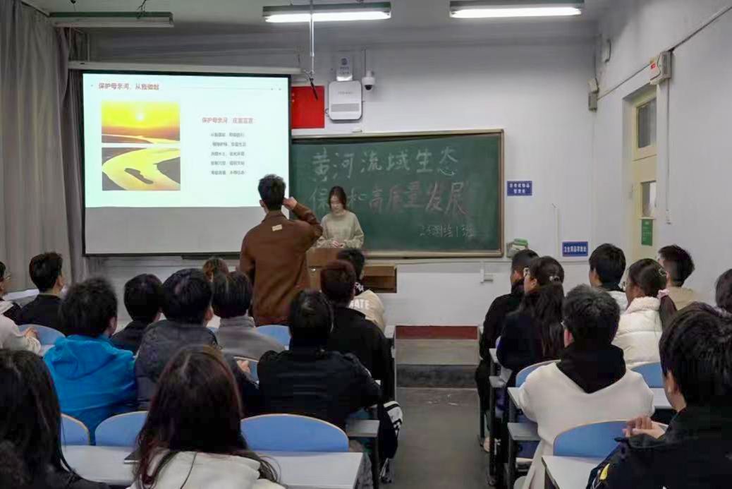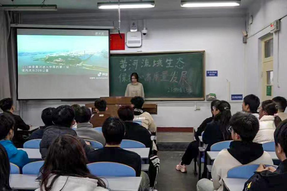 活动第三部分,团支部一名同学通过演讲形式向同学们介绍了黄河关于水资源管理、生态修复、污染防治等方面的问题,阐述了保护黄河的重要性和紧迫性。随着现代化的快速发展,黄河面临水资源短缺,水体污染,水土流失等生态问题日益严重,呼吁同学们积极参与到黄河保护的行动中来,鼓励同学们积极向社会宣传保护黄河,扩大保护母亲河的社会影响力。