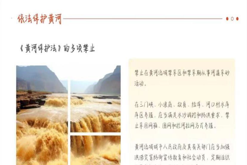 活动第二部分,团支书根据《中华人民共和国黄河保护法》向同学们介绍依法保护母亲河的举措。这部法律全面保护黄河流域的生态环境,对违法行为设定了严格的法律责任。作为新时代青年要详细了解这部法律,积极行动起来,依法保护我们的母亲河。