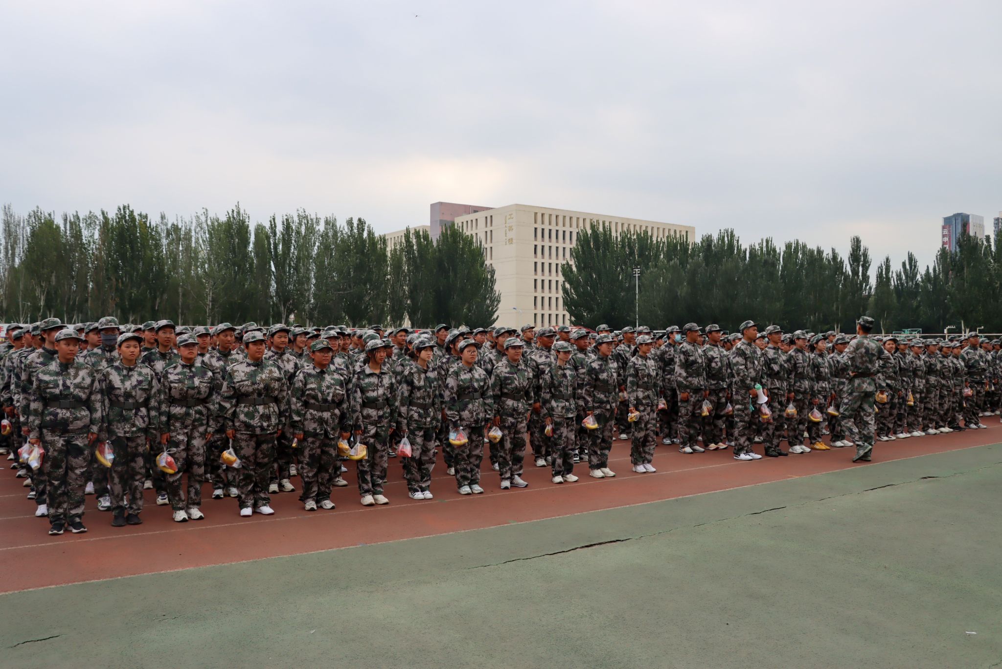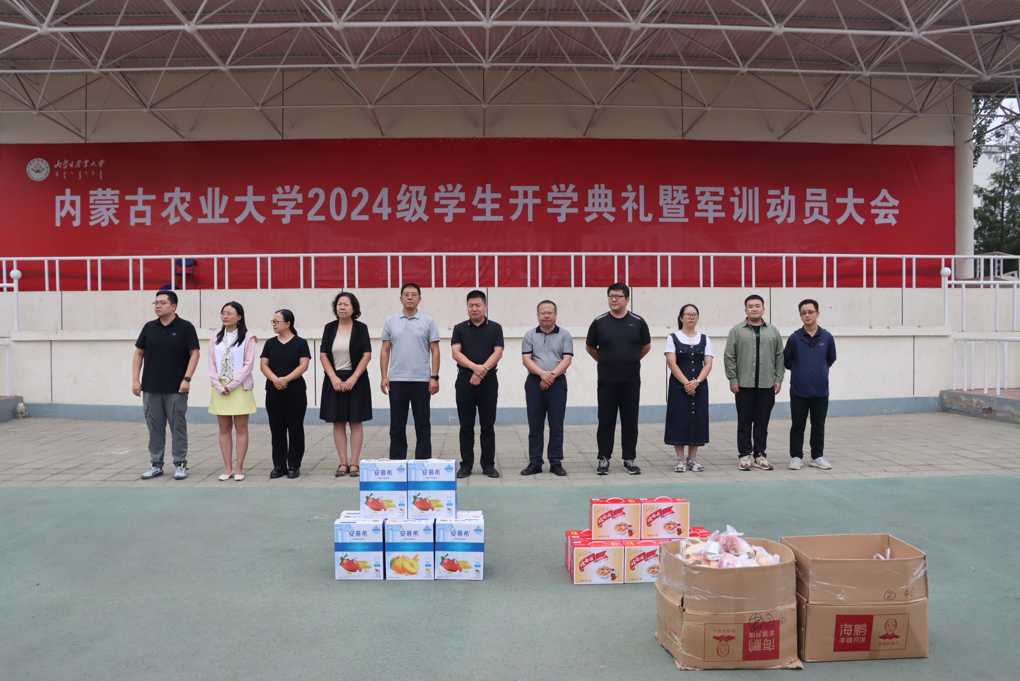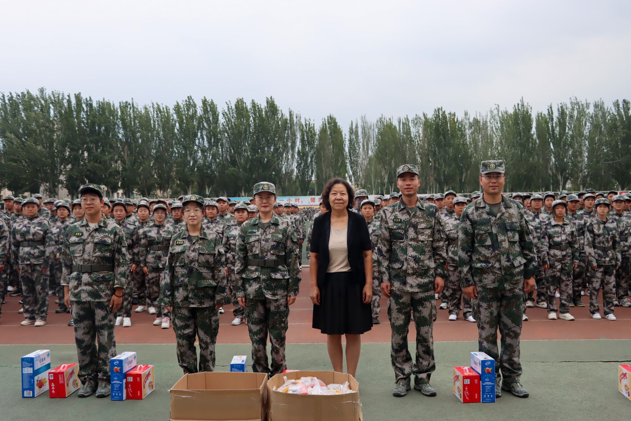 公司经理李昊为承训教官分发慰问品,并与教官们亲切交谈,对教官们严格要求、科学施训、辛勤付出表示忠心感谢和高度赞赏。公司关工委委员李平老师为参加军训工作的辅导员老师分发慰问品,全体领导老师们为同学们分发慰问品。