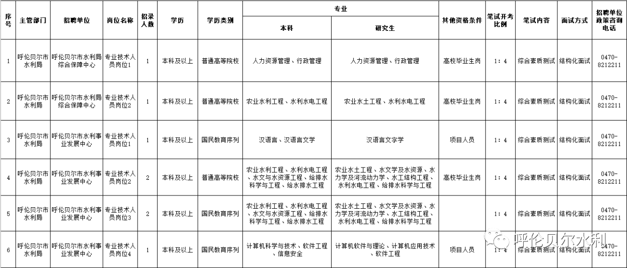呼伦贝尔市水利局本次计划招聘人力资源管理、行政管理、水利工程类、汉语言类、计算机科学与技术等专业共计8个岗位,详情见下图: