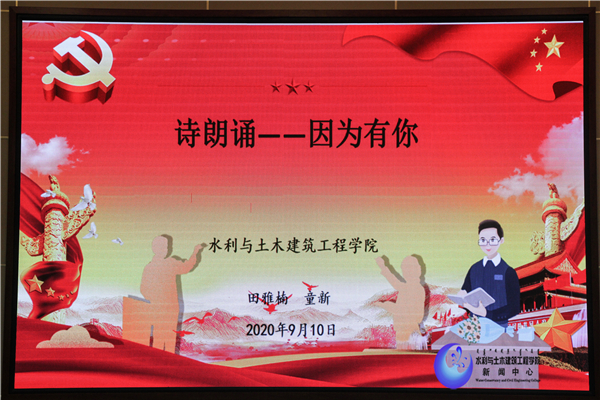 资源环境系教师田雅楠和童新的诗朗诵——因为有你、2019级环工一班顾涛同学和2019级工程造价班刘涵奇同学的诗朗诵——师德颂,生动展现了公司教师立足公司产品岗位助力打赢新冠肺炎疫情防控阻击战、教育脱贫攻坚战的精神风貌,表达了对教师的崇敬之情。
