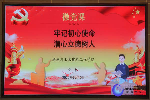行政党支部宣传委员全栋以“牢记初心使命,潜心立德树人”为题讲了微党课,他说,教师作为立教之本、兴教之源,要想培养出“名士”,首先要做“高士”,吐辞为经,举足为法,长怀教范,才能丹心诲人。教师要时刻铭记教书育人的初心使命,敬业守道,三尺讲台尽付平生所学,甘为人梯。他还自创一首词 “浪淘沙·教师节感怀”与大家共勉。