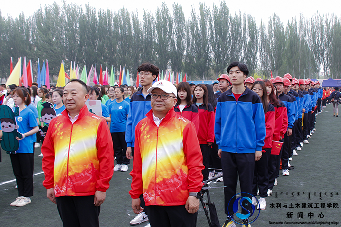 伴随着慷慨激昂的《运动员进行曲》,开幕式正式拉开帷幕。各院代表团方阵依次通过主席台,水建院教师与运动员组成的水建方阵昂首挺胸,迈着坚定有力的步伐从主席台前走过。他们戴着安全帽,手执测绘仪器,捧着最新的无人机向我们走来。他们独具特色的入场仪式不仅令人眼前一亮,而且象征着水建学子建设祖国、为祖国勾画灿烂蓝图的美好愿景!他们始终以“承藉禹风,囊萤酬志,拼搏进取”的院训作为自己的人生准则,在追求与奋进中不断进取。各院代表团就位后举行庄重的升旗仪式。随后,由公司学子与其他公司共同表演了太极拳、健美操等节目。整齐划一的队形、优美的动作、灿烂的微笑,展示出水建学子的青春姿态。在阵阵欢呼声中,本次运动会开幕式圆满落幕。