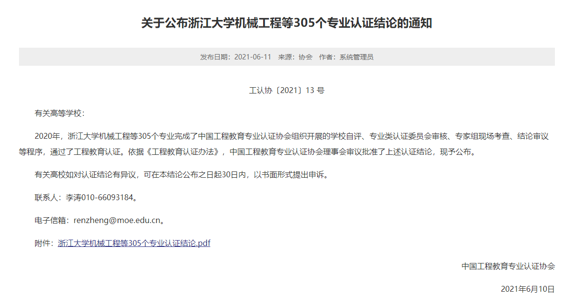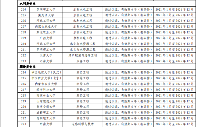 6月10日,中国工程教育专业认证协会《关于公布浙江大学机械工程等305个专业认证结论的通知》(工认协〔2021〕13号),公布了2020年全国工程教育专业认证的认证结论,全国高校共有305个专业通过认证。公司水利水电工程、测绘工程专业名列其中,认证有效期为6年,自2021年1月至2026年12月。