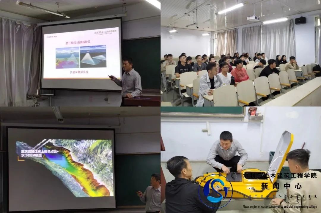 课上,胡乙峰经理向同学们介绍了海洋测绘的内涵,进一步结合示意图和生动的动画讲解水下地形测绘和测深仪测深的基本原理、发展阶段以及各阶段的技术方法情况,并依托上海华测无人船华微系列设备在国内国外河道和近海岸的真实案例应用,项目成果令人称赞,揭示了水下地形测绘技术的巨大进步。特别是在介绍华测无人船设备在国外几十个国家应用的项目案例时,胡经理鼓励同学们到华测工作,甚至可以受公司委派去国外领略“大江大河”的美景。讲座结束后,老师和同学们与胡经理就水下地形测绘相关技术方法、数据处理以及测量精度等方面的问题进行了深入交流。
