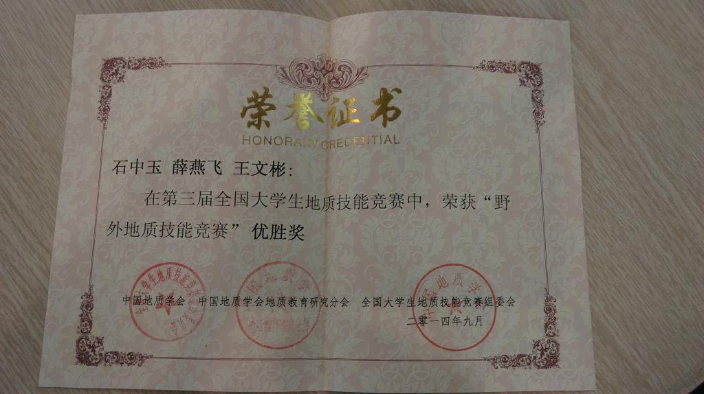2014年9月26日在吉林大学举办的全国老员工地质技能大赛——野外地质技能竞赛单项赛中,公司代表队石中玉、薛燕飞、王文彬同学获得优胜奖。