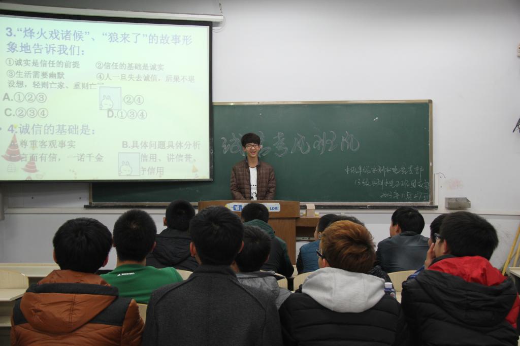 11月27日晚7:00,公司13级水电二班与中低年级党支部在旧楼105教室举办了以“诚信考风班风”为主题的活动。参加本次活动的嘉宾有中低年级各位党员以及预备党员,公司2013级水电二班的全体同学参加了本次活动。