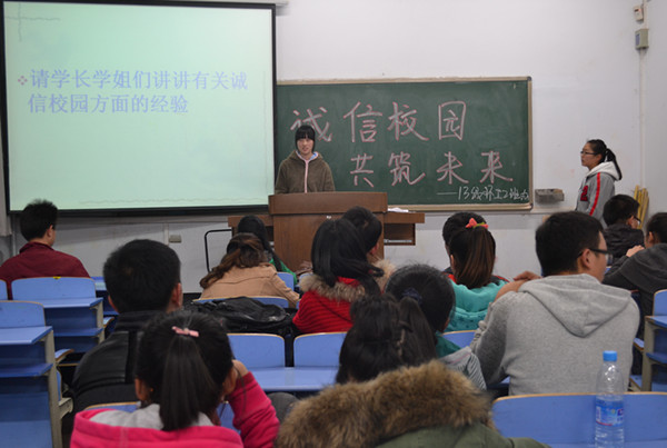 活动开始主持人为大家介绍参加此次活动的各位嘉宾,然后党支部书记张璐为大家讲述了如何诚信考试,接着员工会副主席张良告诉大家怎样诚信考试和诚信学习,然后12级环工一班赵东旭和吕文琪为大家讲述了诚信生活的必要性,之后主持人为大家介绍了关于诚信做人的具体内容,活动中有同学讲故事和嘉宾一起做游戏,其次党组织部组织委员洪英与分团委组织部副部长赵鑫为大家讲述有关诚信入党和诚信学习的要点,然后由活动班级成员发表感想,活动最后由导员陈传阁为大家讲述以后应怎样做好诚信学习生活。