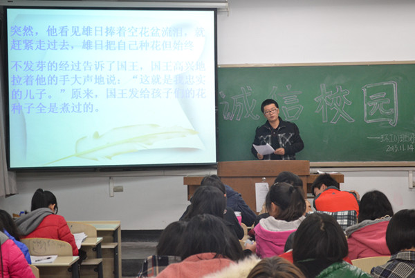 活动开始,班长张宇向大家讲了一个故事引出本次活动的主题,随后通过PPT向大家讲述“什么是诚信、诚信和利益的区别以及诚心的等级描述”,接着,团支书和员工代表为大家讲述诚信考试的重要性,最后高中年级党支部代表为大家讲述学习方法及传授学习经验,并预祝大家在期末有个好成绩。