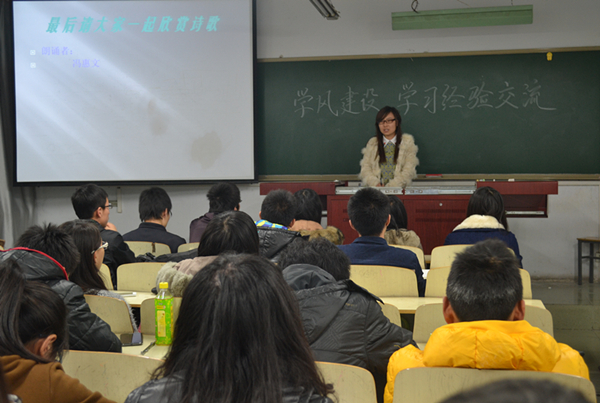 交流会上,主持人首先谈到了有关“诚信考试”的话题。临近期末,各科陆续结课并开始考试,说到考试就不得不谈到考试纪律。大学的第一次期末考,大一新生总是会紧张,害怕挂科,有些人就不得不想一些手段来防止自己挂科。诚信考试就是针对这种情况提出的,况且事关学风建设,作为大一新生,更应该在大学的开始就树立起良好的学习习惯,这不仅是在维护学风建设,更是在对自己负责。拒绝作弊,从大一就要开始。诚信考试的问题过后就是大家的学习交流时间了。水利双语的同学与大家分享了有关学习的诗词还有自己总结的学习经验:多看书;提高学习效率;耐得住学习的寂寞。随后王玉芬老师对同学们的分享进行了点评,并着重强调了诚信考试的重要性。最后由大四的各位学长学姐和同学们分享了自己的学习经验和老员工活经历,活动在掌声中落下了帷幕。
