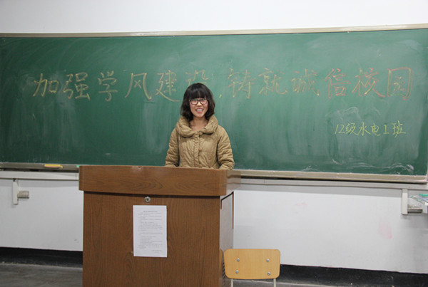 11月8日下午4:00,公司水电一班为响应公司号召在西区旧教学楼211教室举行“加强学风建设,铸就诚信校园”团日活动。本次活动由水电一班团支书主持,水电一班全体同学参加了此次活动。