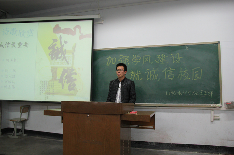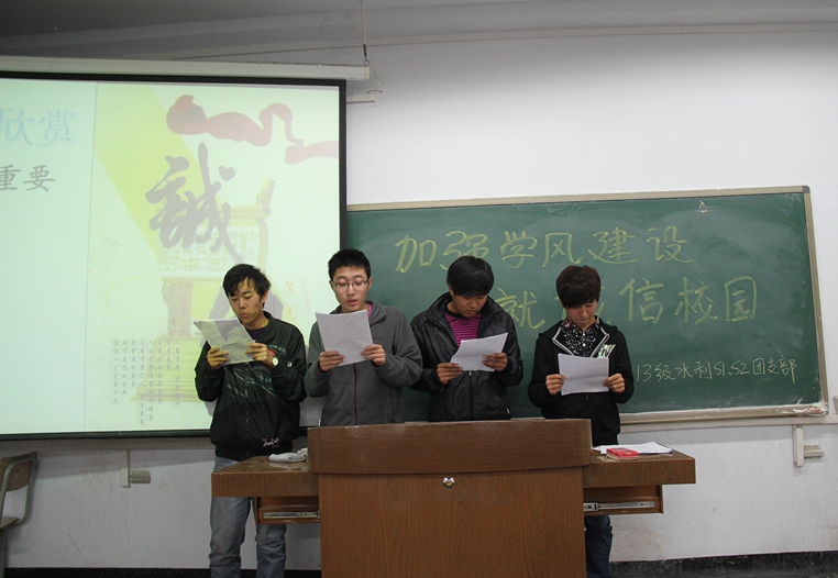11月12日下午2:30,公司2013级水利双语一、二班在西区旧教学楼204教室开展了以“加强学风建设,铸就诚信校园”为主题的团日活动,参加本次活动的嘉宾有员工会副主席张良,学习部副部长张少华,团委组织部副部长田旭乐。2013级农水一班和给排班的辅导员贾腾跃、2012级双语班的王?、刘烨玲、孟月、李京东也参加了本次活动。