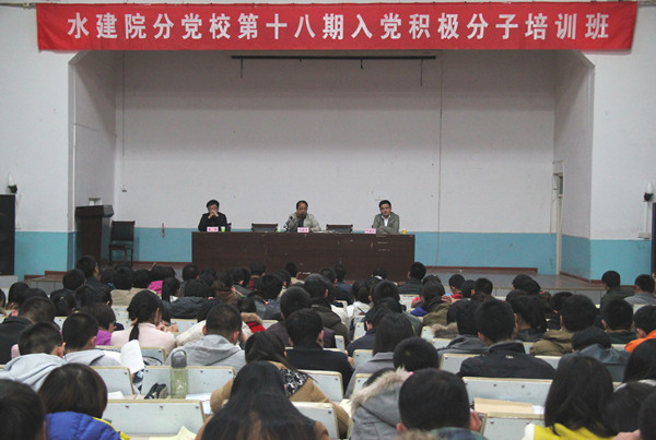 10月28日晚7:00,公司在西区旧报告厅举行水建院分党校第十八期入党积极分子培训班开课仪式。出席本次活动的领导、老师有:太阳成集团tyc33455党委书记杨利田、党委副书记韩瑞平,团委书记叶德成,11级年级主任杨逸隆、专职辅导员张松。