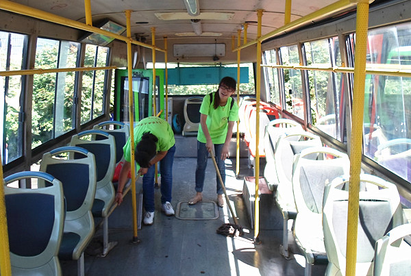 上午9:00,社会实践服务队的同学们到达公交公司。同学们向负责人说明了来意后,在王玉芬的老师的带领下开始清洗公交车。同学们一人需要擦一辆车,分配好任务后,同学们拿着刚洗好的墩布,认真的把公交车里面墩了一遍,并且用抹布将车子外面擦干净。经过近三个小时的认真清洗,同学们基本上把公交公司的公交车都清洗了一遍。负责人对同学们今天的社会实践的表现感到很满意,并希望同学们今后能多组织些这样的社会实践活动。