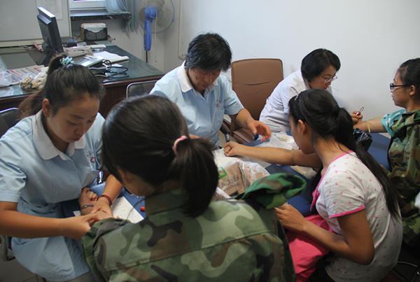 8月29日早6:30开始,公司参加军训的2013级所有新生,到公司校医院进行老员工体质健康检查。公司新生体检共分为三批:第一批6:30开始、第二批7:00开始、第三批7:30开始,分别由公司专职辅导员张松老师、斯仁达来老师、王玉芬老师和吴青海老师带队,本次体检总人数共有579人。