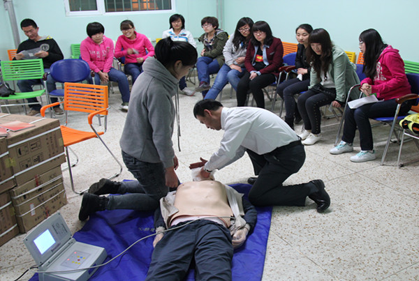 本次培训会主要讲2012年新版心肺复苏术,简称cpr。首先,解老师通过精心准备的幻灯片向同学们讲述了导致心跳呼吸停止的一些现象,Cpr的目的及具体步骤。经过理论知识的铺垫后,解老师又开始给大家演示,一边演示一遍解说,让同学们能更清楚、准确、快速的掌握步骤。然后,同学们开始自己练习,争取每人都练习一次,解老师细致的进行现场指导,要求每一步都要准确到位。培训活动结束后,心育部部长要煜东代表公司对解老师的到来表示感谢,同时,他还希望同学们能发挥其作用,将所学的知识运用到实践中,让周围人都能提高自己的应急救护能力,保证自己及他人的生命安全。最后,同学们一起与解老师合影留念,结束本学期的红十字培训会。