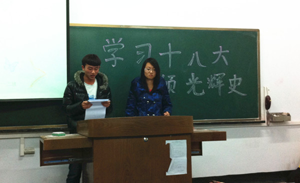 为了庆祝党的十八大的胜利召开,深入贯彻落实我党的十八大精神,公司11级农水一、二班于12月6日晚7:00在西区旧教学楼104教室组织开展了一次以“学习十八大,回顾光辉史”为主题的团日活动。出席此次活动的有公司11级农水1、2班班主任王慧明,公司分团委组织部副部长樊江波、陈旎及农水1、2班全体同学。