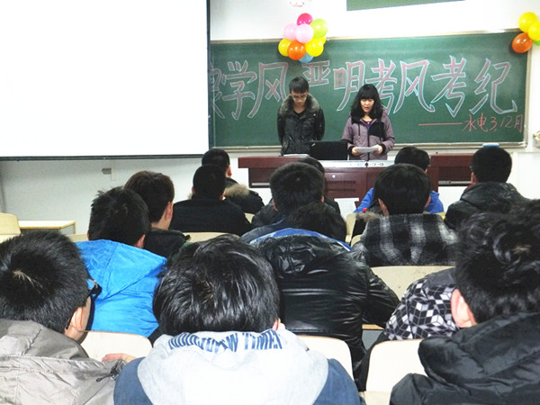 活动中,首先主持人介绍了活动流程,宣读了活动目的。接下来水电3班的同学积极表演了节目,班长展示了PPT,强调了考场秩序以及作弊的处分,在考试中要遵守考试规则。学长和学姐们向同学们介绍了他们的学习经验。最后由班主任贺兵对本次活动做了最后的总结,要求同学们诚信考试。