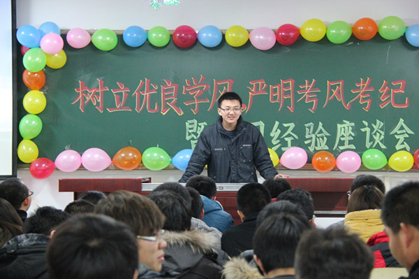 12月9日下午5:00,12级土木一、二班在新教学楼617教室举办了以“树立优良学风,严明考风考纪”为主题的活动。出席本次活动的嘉宾有:12级土木一、二班班主任李平,各年级优秀员工代表翟涛、李金刚、李振业,组织部副部长马晓凯,12级辅导员郑欢、董欣欣、魏云雷、刘亚春、宁可仁、李志辉及12级土木一、二班全体同学。