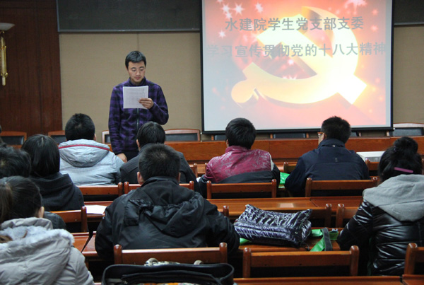 会议中,吴青海老师首先对本次活动做了详细介绍,并作出了四点要求:第一,要求各班级同学之间相互调查关于对十八大精神的认识,尤其是上过党课的员工;第二,每月开展一次党支活动,全面贯彻党的十八大精神;第三,宣传十八大精神,让每位党员积极主动的做一个合格公民;第四,每个党支部在贯彻十八大精神的同时,要求学员写心得,最终会评选出优秀心得。吴老师还为大家播放了视频《信仰》,他强调同学们应该认真仔细的观看,去用心体会《共产党宣言》自诞生起对中国的深远影响。最后吴老师做出总结,希望每位同学能弘扬十八大精神,大力提高中国共产党在我们心中的地位。