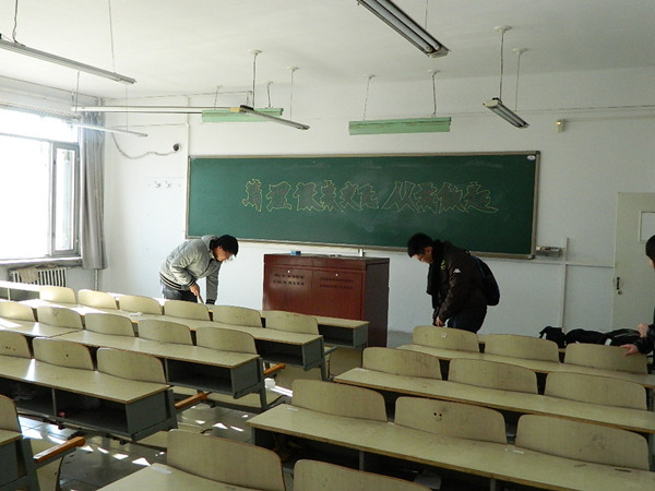 在负责人分配完任务之后,各位同学有序地打水、清理桌洞、擦桌子。过程中同学们用抹布和洗衣粉认真清理了桌面及椅子上的污渍,将上面的字迹去除掉,还把地面打扫干净。为广大师生创造了良好的学习环境。虽然清洗过程有些辛苦,但看到清洗后干净后的桌椅同学们感到非常欣慰。在同学们的积极合作下,清洗工作很快就完成了。