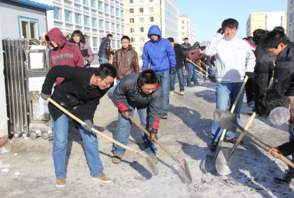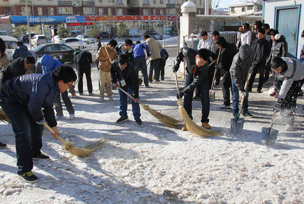 路上看到的是厚厚的积雪和坚实的冰面,但看不到同学们的畏惧,看到的是他们的劳动热情和合作精神。虽然清理路面上的积雪的较厚而且很多积雪都结成冰贴在地面上,很难清理,但是同学们各尽其力,干的都很起劲。在三个小时的共同努力下,同学们完成了各自的任务,整理好工具,结束了本次活动。一条条干净的路面出现在了眼前。纵然寒冷,但仍然有很多同学都表示:“以后有机会一定还会参加这样有意义的活动”。