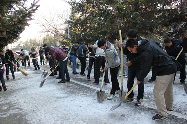 志愿者们都带着饱满的热情来到了水利楼前方,同时也准备好了铲雪和扫雪的工具。在志愿者们分配好了各自的任务之后,就开始了铲雪。铲雪的志愿者们排成长队铲得井然有序,扫雪的志愿者们紧随其后将铲下的积雪扫到一边。虽然天气很冷,但志愿者们干得满头大汗。志愿者们分工明确,清理积雪很迅速,最后志愿者们将大部分积雪清理干净。