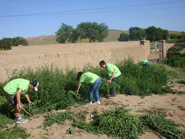 由于这里四面环山,交通不便,气候恶劣,农作物较难生长,农民收入较低,导致大量劳动力外流。青壮年进城务工,村里人多半是留守老人和儿童。大部分民居已无人居住,院内杂草丛生。于是同学们决定分区域帮助村民清除院内杂草。有的用镰刀,有的用锄头,经过两个小时的卖力劳动,终于完成了任务。