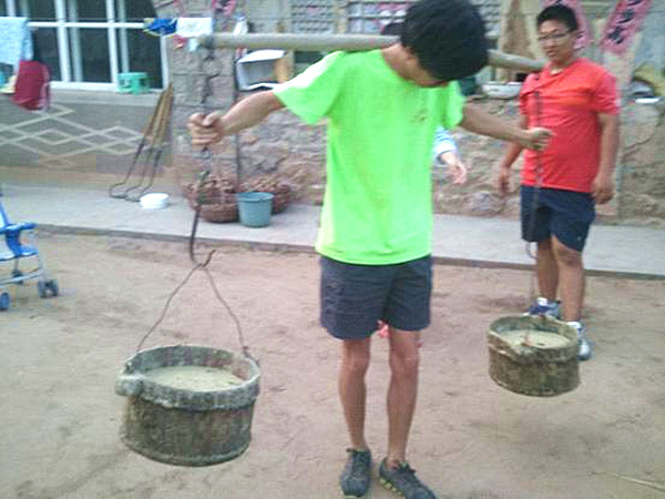 陈潇洋同学和黄继顺同学积极地帮助农家放驴、挑水,每天饭后还会帮着农家阿姨拌猪食、喂猪。农家的活总是又脏又累,陈潇洋同学和黄继顺同学本着不怕脏、不怕累的精神为乡亲们服务。