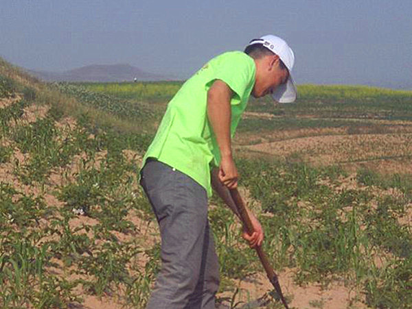 王太福同学总是积极主动地和农民一起去锄地,并且专心的学习该如何锄地。不论是在炎炎烈日下,还是在寒冷的山风中,王太福同学始终坚持帮农民锄好地。在回家的途中,一直沉默的王太福同学向同学们透露了他的真实想法:同学们要干一行爱一行,不论做什么,都应认真地对待。辛苦劳作的村民,每天都遵循着“晨兴理荒秽,带月荷锄归”自然规律。同学们应尽自己一份微博的力量,帮助这些朴实的村民们减轻负担。