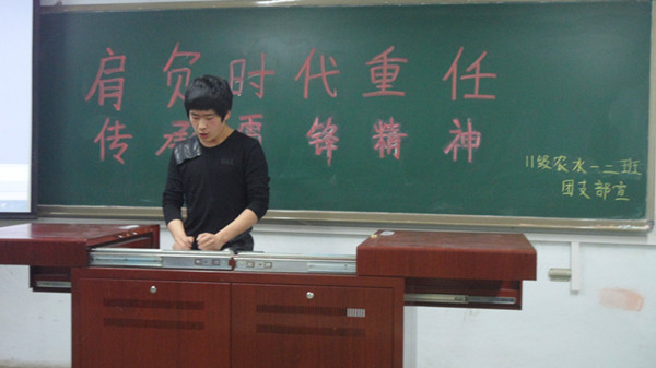 3月15日晚7:00,公司11级农业水利1、2班于新教学楼举行以“肩负历史重担,传承雷锋精神”为主题的团日活动。公司分团委组织部副部长钟铃、卢星航及农水1、2班全体同学参加。