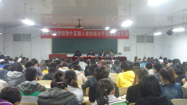 首先,主持人叶德成老师介绍出席嘉宾及此次动员大会的流程。接着,陈爱和老师对入党积极分子培训班的日程安排,即每次党课的主题和讨论的题目进行了介绍。接下来韩瑞平老师开始为积极分子们上第一堂党课。韩老师围绕“开办入党积极分子培训班的目的和意义”和“党员的理想与信念”两个话题作讲解。韩老师讲了作为入党积极分子的责任、应有的理想与信念、要做新世纪的雷锋等问题,并要求同学们端正入党动机,时时发挥积极分子的先锋带头作用。大会最后,韩老师对同学们提出几点上党课时的希望,希望同学们认真上党课、做好笔记、积极讨论。会议结束后,各支部入党积极分子就所给主题进行讨论,交流想法与意见。