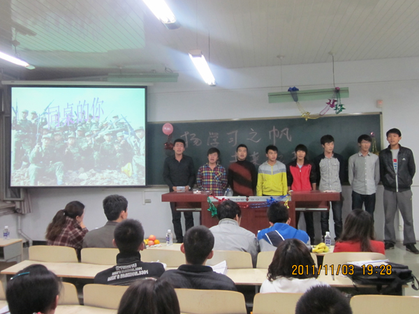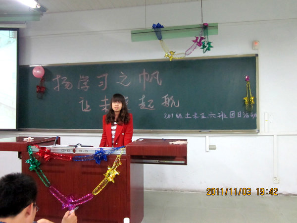 11月3日晚7:00,11级土木五、六班团日活动在新教学楼203召开,活动主题是“扬学习之帆,让梦想起航”。参加本次活动的有学办王玉芬老师,团委组织部白勇,08级土木二班学长,土木五、六班班主任、辅导员和全体同学。