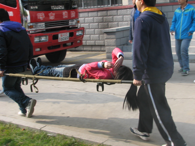 此次演练按照预定方案有序进行。首先,由消防员放烟雾弹模拟火情,火灾报警器启动后,同学们在疏散人员的指挥下用湿毛巾捂住口鼻,手扶楼梯、墙壁迅速下楼,或由部分员工用担架抬出伤员,并从通道口撤离“火灾”现场,疏散到安全地点。大部分员工撤离后,消防救援人员使用云梯、充气垫等专业救援工具救出在高层楼没有撤离的员工。最后消防员使用高压喷射器将火扑灭。此次消防应急演练持续了40分钟,演练结束后,由消防救援人员为同学们讲解灭火器的使用方法,并介绍了一些火灾发生时必要的自救方法。