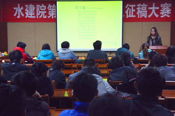比赛开始,入围决赛的15名选手一次上台朗诵自己的作品,并且进行自我介绍以及阐述作品的写作背景。接着,评委就文章内涵和个人感悟等方面进行提问,参赛选手现场回答。同学们上台后都认真朗读,细心描述,大声发言,希望自己精心创作的文章能给大家留下深刻的印象。最后,评委们根据参赛选手的文章写作水平和台上表现,按照评分细则给出其最后得分。经过激烈的角逐,最终10级水电1班钱龙娇同学的《青玉案》荣获一等奖,杨逸隆老师为她颁奖并合影留念。其他评委老师分别为获得二等奖、三等奖及优秀奖的同学颁奖。