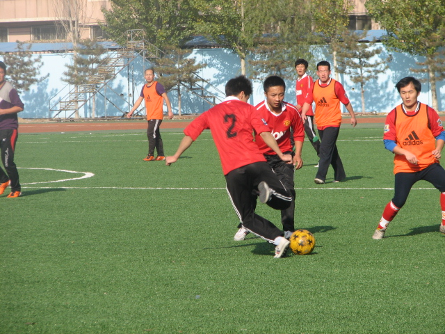 比赛开始,中场发球,两队分别散开在各自的区域内。他们身体前倾,如同一只只准备雄狮。赛场上你追我赶,每个人都不甘弱示,摔倒了,爬起来,继续向前冲。看!就在守门员还没反应过来时,足球 “嗖”的一声已经向球门飞去,只听见场外观众一片欢呼声。前半场进行了45分钟,每个人的体力都耗费大半。但从他们的表情中看到的是必胜的信念。中场休息,各领队通过上半场的经验,探讨下半场要注意的问题。短暂的休息过后,很快进入了下半场比赛,即使他们都已经筋疲力竭,但为了公司的荣誉,他们还在拼命奔跑。新绿的操场上,被这些穿着红?黄队服的球员点缀的生机勃勃。