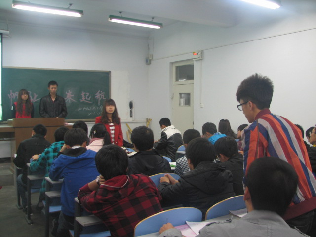 一首《平凡的爱》拉开了此次活动的序幕。在辅导员介绍了来宾之后,同学们积极踊跃地发言交流了自己的学习经验。接下来是本班同学自导自演的英语话剧,话剧活跃了现场的气氛,也体现出同学们对英语的足够重视。随后回到本次活动的主旋律——学习,本班同学与10级的学长学姐进行了互动,提出了“高数难,不会制图,没有学习动力”等问题,王玉芬老师以及10级的学长学姐耐心详细地解答了他们提出的问题。其中王玉芬老师讲到,自己上大学时的动力就是不忍心父母那样辛劳,这让同学们在感动之余受益匪浅。接下来的脑筋急转弯和合唱的老歌《朋友》将本次活动推向了高潮,歌曲唱出了他们要像朋友一样走过大学四年。