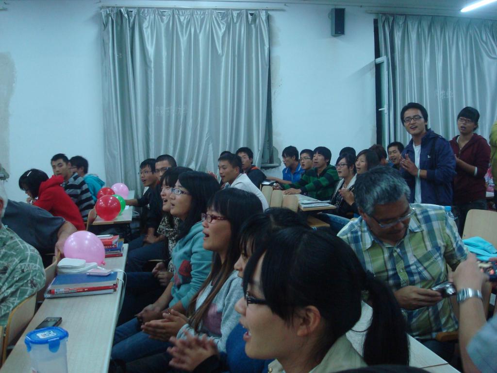 教室里坐得满满的,大一新生们各个都精神洋溢。在对外教老师们经过了热烈的欢迎后,口语交流会很快拉开了序幕。外教老师们的豪爽、热情使同学们很快就跟随他们进入了英语的世界。首先,外教老师们依次介绍了自己的姓名及一些家庭情况,并与同学们进行了互动,同学们积极提问,与外教们默契配合,使气氛变得很活跃,整个场面笑声不断。