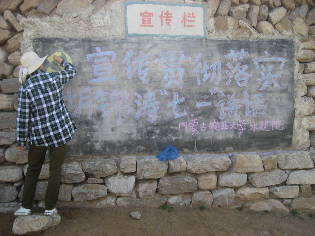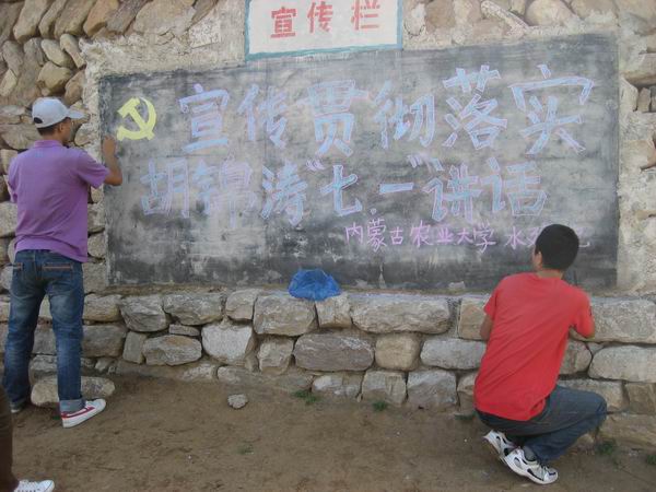 队员们得知这件事后,部分同学就主动留在大阳坪村村委会办公室,打扫卫生,整理桌椅,在村头的小黑板上画宣传画。虽然条件艰苦,但大家都尽自己的所能,发挥自己的真才实学,用现有的纸张去写条幅、有限的粉笔去装饰着黑板的每一角,尽力为领导营造一份融洽的氛围,一种家的感觉。