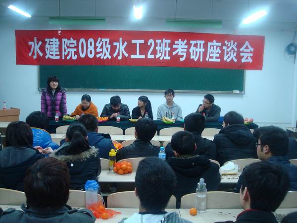 水建院08级水工2班考研座谈会于2011年3月24日晚7:00在新楼103举办。参加本次活动的有水建院李仙岳老师、贾文亮老师、张志杰老师、魏丰良指导员及几位研究生学长。此次活动外观布置让人眼前一亮,给人一种惊喜的感觉。