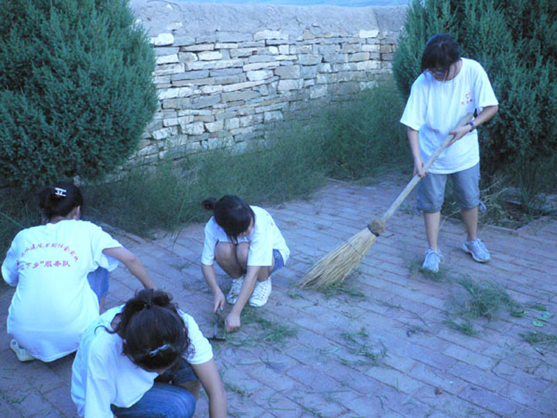 接连几天来一直炎热酷暑,天气作美,今日一阵阵细雨给这里带来了凉爽的感觉。清晨,大家照常在5:00起床。简单的打扫了家务之后,队员们开始上山割草、锄地。山上有大片大片的玉米地与田地,青黄相间,空气很好,让我们一下子就感到了一股淳朴亲切的气息,很温暖。