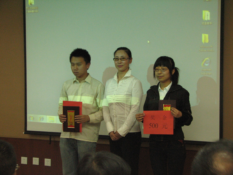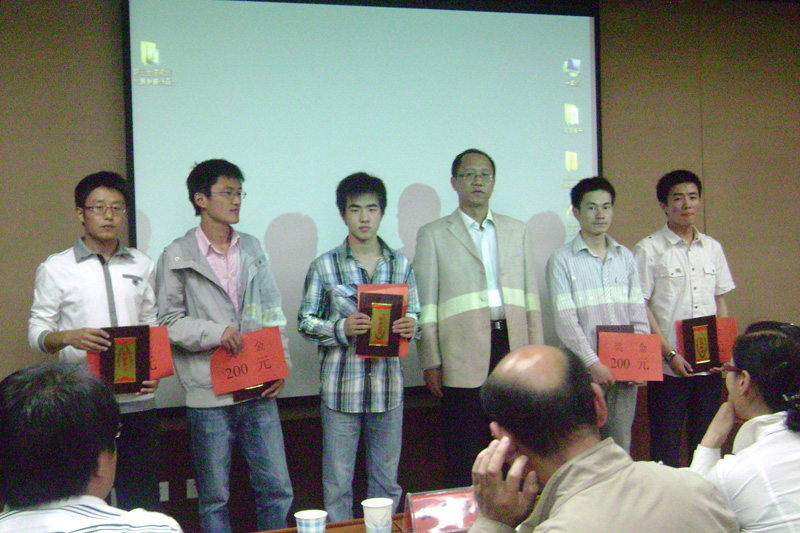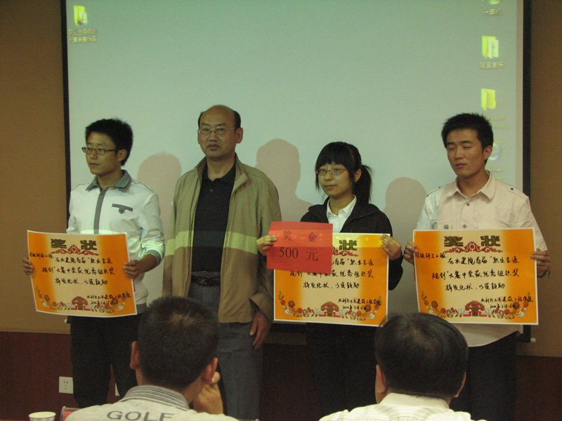 本次比赛共评出一等奖两名、二等奖三名、三等奖五名和优秀奖若干名。其中一等奖由08级给排二班刘?同学和周羽佳同学获得。颁奖仪式上,副董事长侯晨曦、员工工作处处长靳小平、公司团委书记那森巴雅尔、人才招聘处副处长张文分别给获奖的同学颁发荣誉证书和奖金。另外,在本次比赛中,08级给排二班、08级测绘二班、08级环工二班还被评为“优秀组织单位”,公司分党委书记王耀强教授为三个班级的员工代表颁发了奖状和奖金。