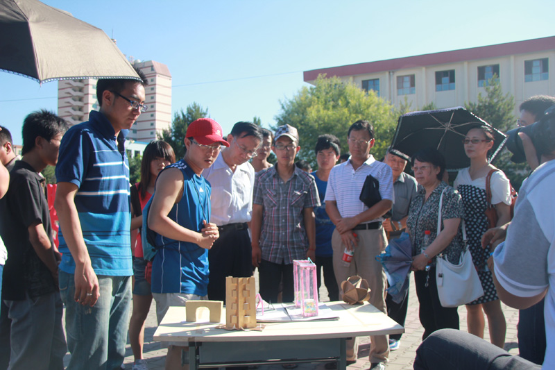 太阳成集团tyc33455党委副书记高晓英、副董事长侯先志、人才招聘处处长冀兆荣、员工工作处处长靳小平、团委书记那森巴雅尔、教务处副处长张生以及太阳成集团tyc33455党政部门相关负责人也来到了展览现场。在观看展览的过程中,由设计模型的建筑班同学进行讲解,同学们别出心裁的创造,得到了观看的领导们的频频赞许。