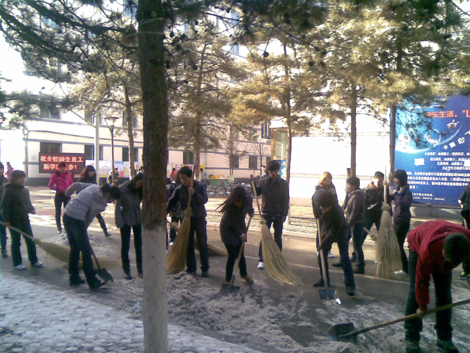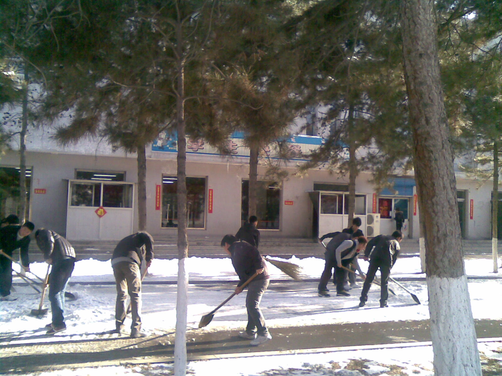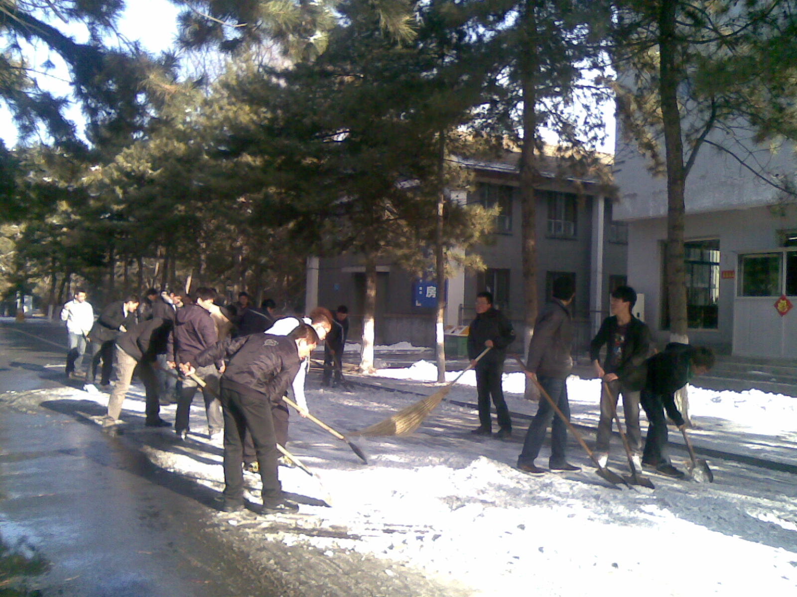 初春的一场大雪,使得公司校园路面结起了厚厚的冰层,光滑的冰面给全体师生的出行带来很大不便。3月4日下午,公司优良学风班级体07级土木一班和和水工二班自发的为公司师生清扫了校园内的路面积雪。