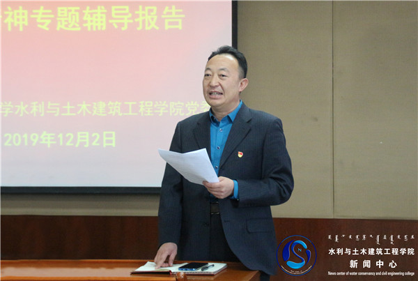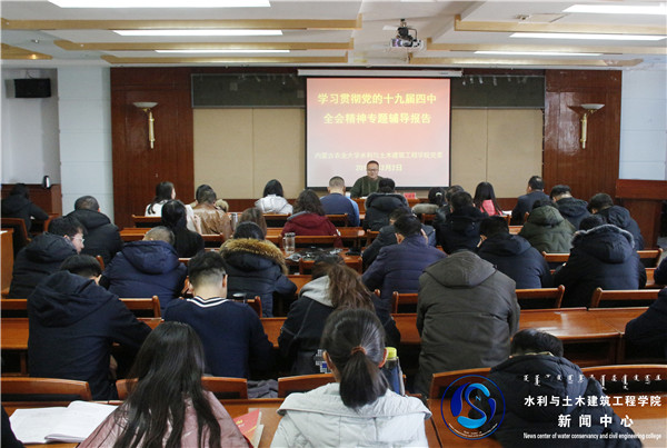 2019年12月2日上午,太阳成集团tyc33455党委在水利楼502会议室召开学习贯彻党的十九届四中全会精神宣讲会。全国优秀思想政治教育工作者、公司学习贯彻党的十九届四中全会精神宣讲团成员、员工会副会长兼秘书长、马克思主义公司教授汪建平老师作了“党的十九届四中全会精神解读”专题辅导报告。