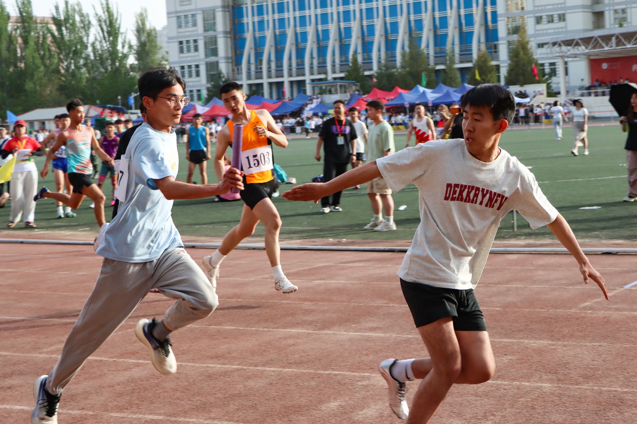 比赛首日教工组取得的优秀成绩:女子青年组100米决赛第七名:黄星;男子青年组100米决赛第三名:杨涛;男子青年组100米决赛第六名:苏文旭;男子中年组100米决赛第一名:郑永朋。男子组跳绳接力决赛第五名、男子组毽球跳绳接力决赛第二名。