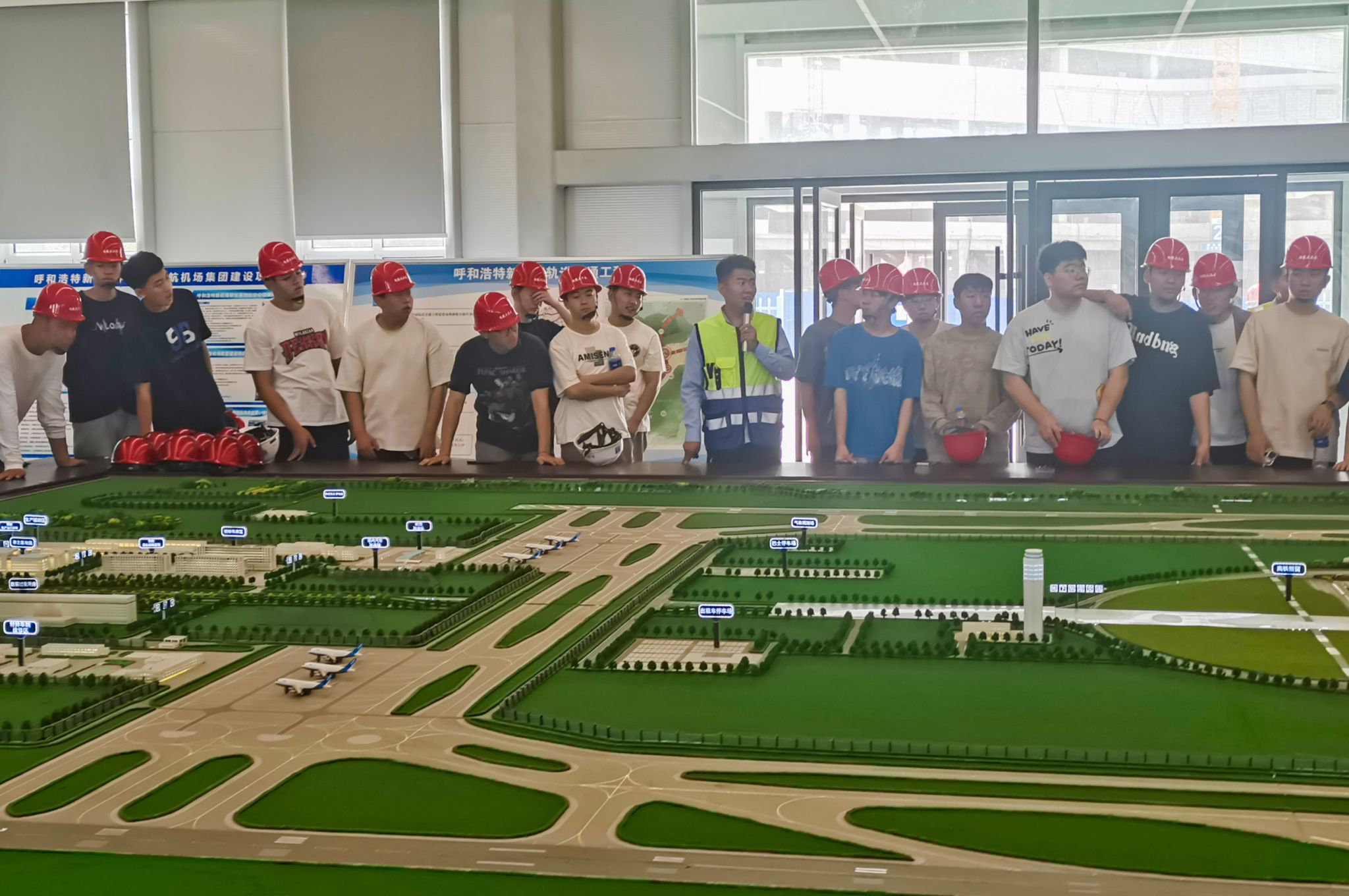 2022级土木工程专业的同学们在老师的带领下,参观了内蒙古第三建筑工程有限公司承建的呼和浩特盛乐国际机场工作区工程施工总承包四标段项目和新机场的1:400沙盘模拟展厅。现就职于中国建筑第八工程局的公司2017届土木工程专业毕业生常永强,结合沙盘模型向同学们介绍了正在建设的新机场项目,带领同学们参观了机场航站楼。
